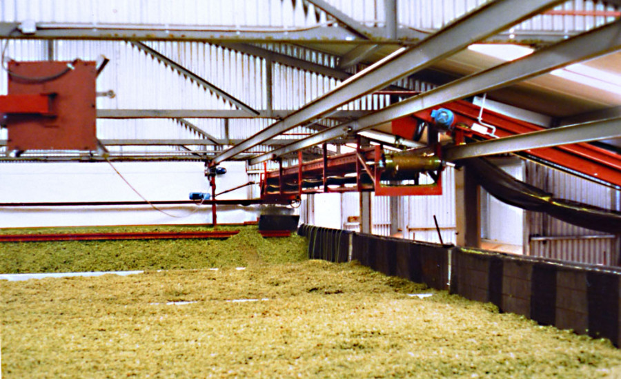 Numerous conveyors receive hops from the farm trailers and transfer them at each stage between and within the buildings. A novel feature was the inclined, two speed reversible conveyor for spreading the hops on the conditioning floor. The conveyor oscillates continuously advancing at high speed, retracting at low speed thereby spreading the hops uniformly across the bed.