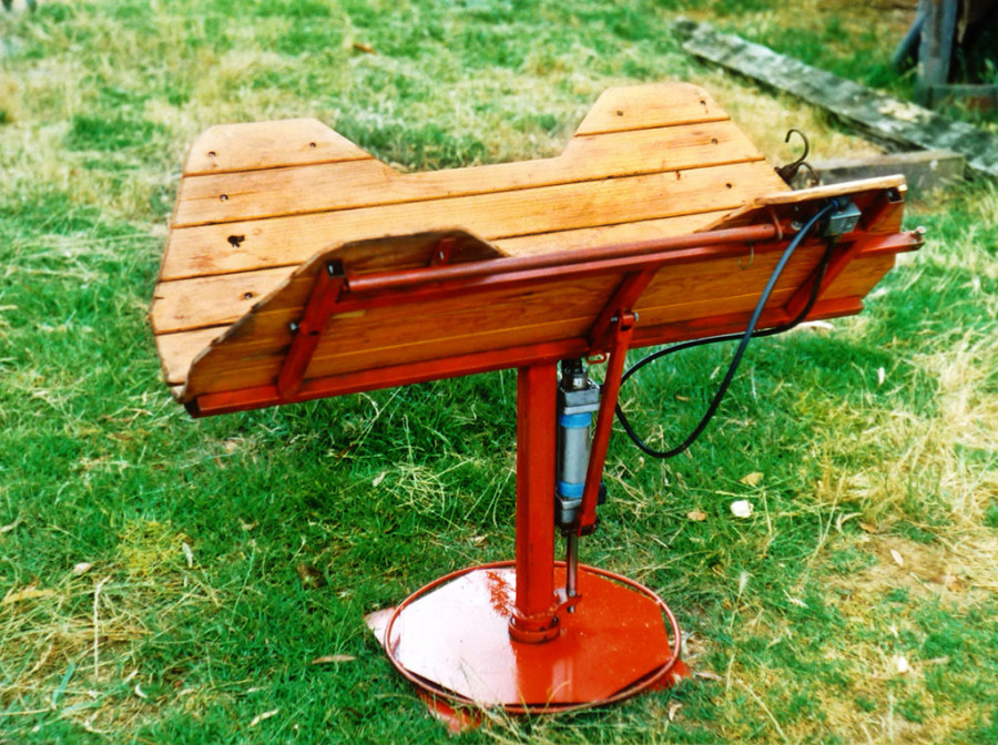 A nudge of the knee by the shearer allows the table leaves (hinged at the centre) to be raised thus confining the animal and presenting it for convenient removal of belly wool. Another nudge, the leaves lower, and the sheep can be rolled to one side and the shearing continues. A kick on the disc footplate unlocks the central pivot, allowing the table to be spun around 180 degrees to shear the other side.