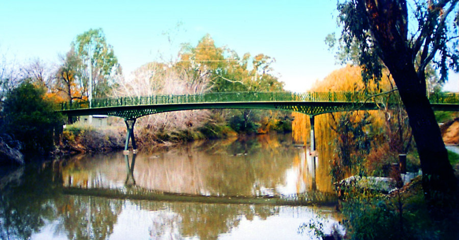 Curved steel lattice girders impart a graceful, slender appearance to this bridge over the Ovens River. Nevertheless the girders have sufficient strength to carry crowds of pedestrians plus heavy cement-lined sewage and other service pipes nestling between. An overall width of 3.3metres ensures that the bridge can be used by road vehicles such as fire trucks, ambulances in an emergency.