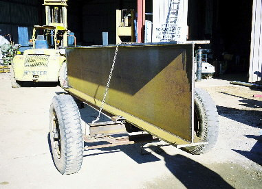 Since the bridge was 21 metres long, the pair of galvanized steel girders each had to be made in three parts, 6, 9 & 6 metres long, with bolted joints. Special pads were added to the girder sections, enabling them to be bolted in pairs to a truck axle and also to a tow coupling at the front. This formed a trailer chassis, able to carry one of the 9 concrete deck slabs. With another deck slab on the 6 wheel drive truck the entire bridge, including gabion (steel mesh rock cage) abutments, was transported to site in five trips.