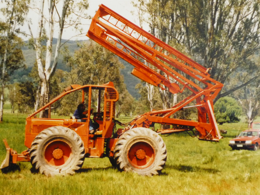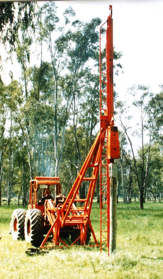 Based on a 4 wheel drive log skidder this pile driver was designed to drive timber poles and steel rails along river banks to control erosion. Considerable design effort went into designing the mechanism to achieve compact furling/unfurling, without having to remove/disconnect any item, including the 750kg hammer, or the hoist cable.