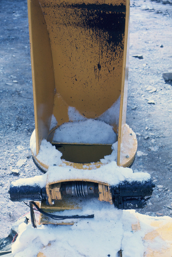 Completely self-contained, powered by an air-cooled VW industrial engine, the blower attaches to the grader main blade frame in place of its central blade. The existing blade mechanisms give total control of the position, height, offset, and angle of the blower. An “umbilical cord” connecting the blower to its control box fitted in the cab enables the operator to control blower functions – stop/start, speed, direction of throw.