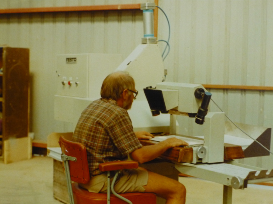 The machine is fully pneumatic, not only the air cylinders which actuate the motions, but also the control system – sensors, timers, valves. The only electrical function is the pair of spotlights illuminating the marks on the sheet.