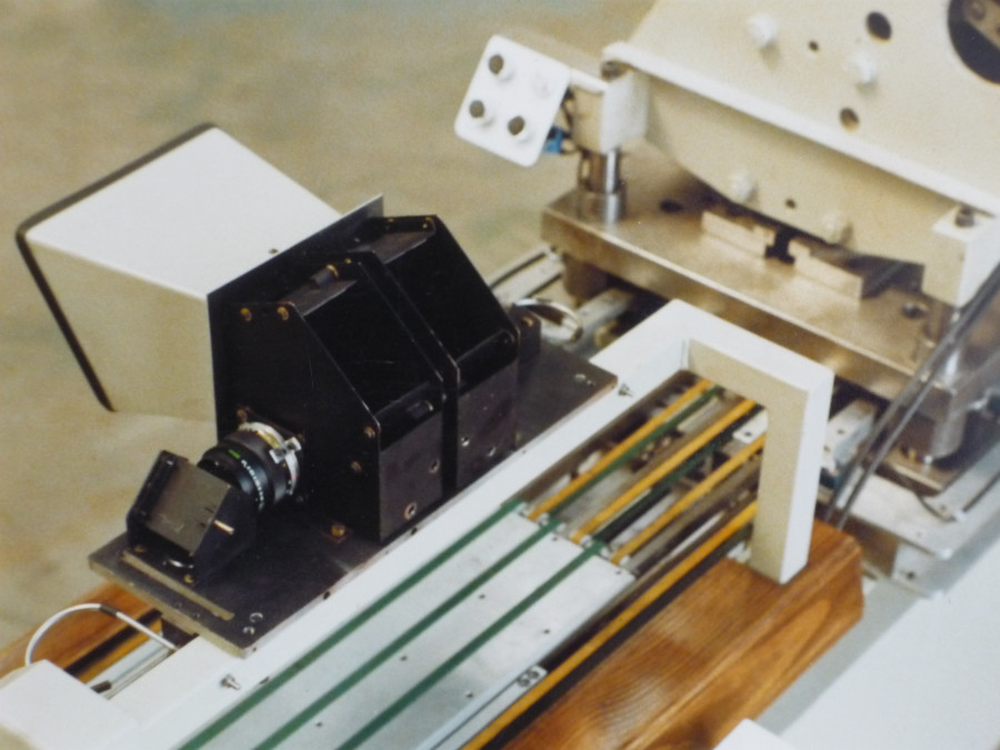 The distance between the periscopes had to be adjustable to cope with the variation in sheet size which occurs during lamination in the previous stage, adjusted by means of a simple handwheel. The adjustment, typically up to 3mm, is also stored in a “mechanical memory” within the table supporting the sheet. As soon as the adjustment is correct and the previous sheet has been completed the operator presses the start button. This turns on a vacuum, sucking the sheet firmly onto the table, which then transfers it horizontally to the punch station. The “mechanical memory” stored in the table is transferred to the automatic feed mechanism, adjusting its incremental stroke.