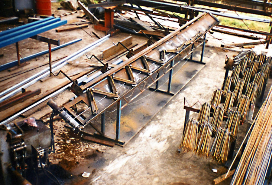 Round steel rods for light open web trusses are bent into the familiar zig-zag pattern in one fell swoop by this machine. The operating principle is akin to a bike chain with a wire woven through the links – pulling on the wire “concertinas” the links into the zig-zag pattern.